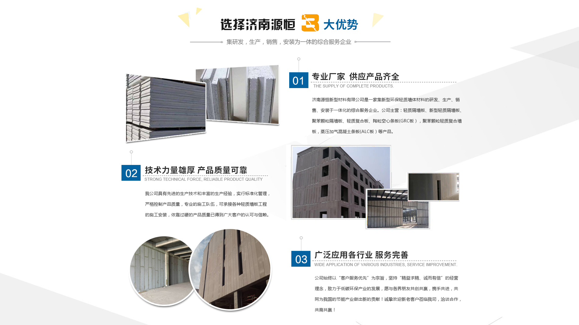 濟(jì)南源恒新型材料有限公司坐落于美麗的泉城濟(jì)南,是集新型環(huán)保輕質(zhì)墻體材料的研發(fā)、生產(chǎn)、銷售、安裝于一體化的綜合服務(wù)企業(yè)。我公司具有的生產(chǎn)技術(shù)和豐富的生產(chǎn)經(jīng)驗(yàn),為您提供輕質(zhì)隔墻板、新型輕質(zhì)隔墻板、聚苯顆粒隔墻板、輕質(zhì)復(fù)合板、陶粒空心條板(GRC板),聚苯顆粒輕質(zhì)復(fù)合墻板,蒸壓加氣混凝土條板(ALC板)等產(chǎn)品,本公司有專的施工隊(duì)伍,可承接各種輕質(zhì)墻板工程的施工安裝。輕質(zhì)隔墻板是國(guó)家推廣使用的新型輕質(zhì)、綠色無害建材,是墻改節(jié)能政策大力扶持的環(huán)保節(jié)能產(chǎn)品,是發(fā)達(dá)國(guó)家普遍采用的新型墻體材料。濟(jì)南源恒新型材料有限公司實(shí)行標(biāo)準(zhǔn)化管理,嚴(yán)格控制產(chǎn)品質(zhì)量,依靠過硬的產(chǎn)品質(zhì)量已得到廣大客戶的認(rèn)可與信賴。公司產(chǎn)品遍布各大城市,與國(guó)內(nèi)多家客戶建立了良好的合作關(guān)系。公司始終以“客戶服務(wù)優(yōu)先”為宗旨,堅(jiān)持“精益求精、誠(chéng)而有信”的經(jīng)營(yíng)理念,致力于低碳環(huán)保產(chǎn)業(yè)的發(fā)展,愿與各界朋友共創(chuàng)共贏,攜手共進(jìn),共同為我國(guó)的節(jié)能產(chǎn)業(yè)做出新的...